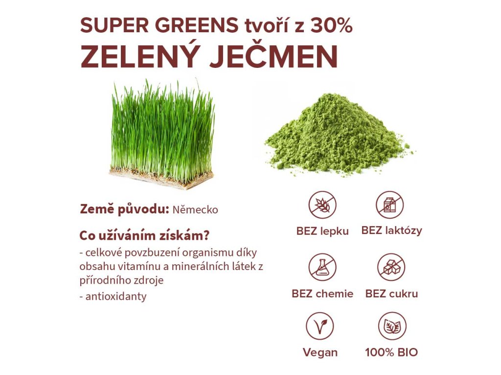 Spirulina, chlorella, zelený ječmen, mladá pšenice a špetka máty v dokonale vyvážené kombinaci pro podporu trávení, imunity a celkové vitality organismu. | 90 g