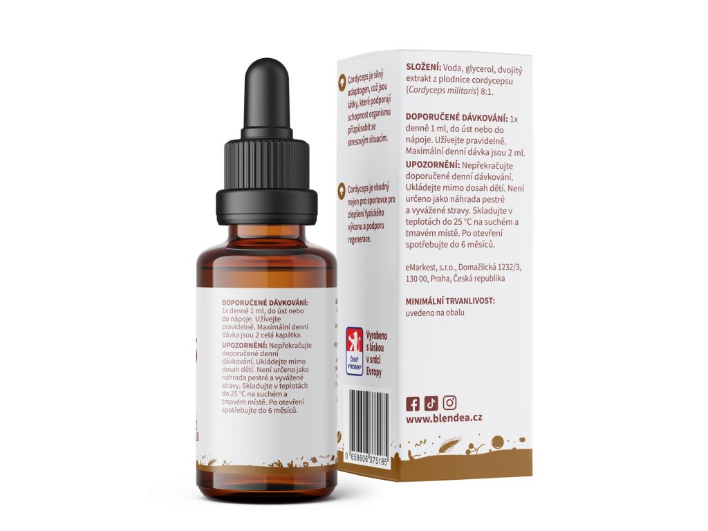 Cordyceps kapky Blendea obsahují vysoce koncentrovaný extrakt z Housenice čínské známé pro pozitivní vliv na fyzický výkon, regeneraci a odolnost vůči stresu. | 30 ml