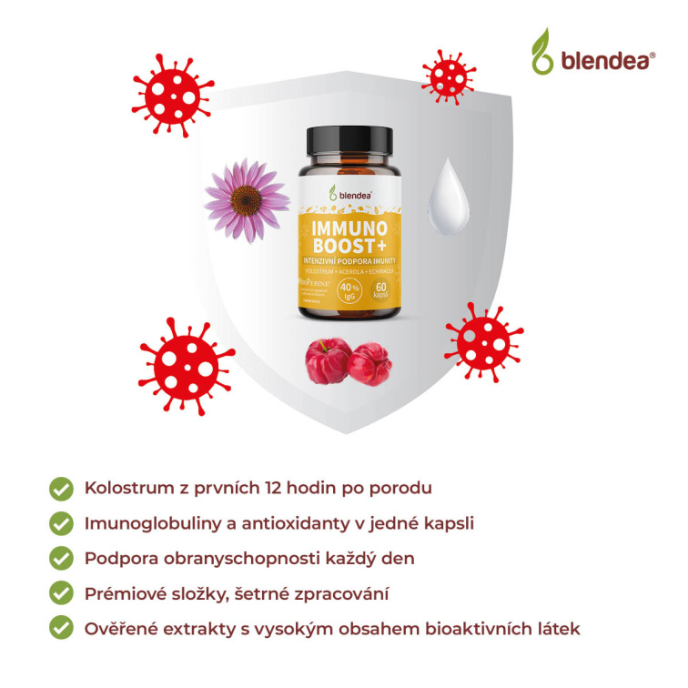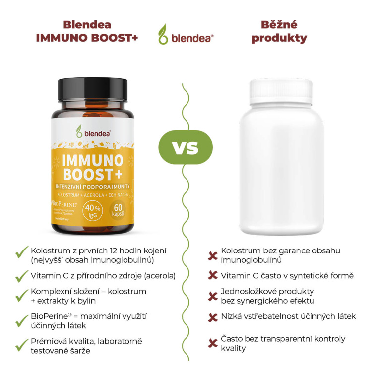 Spojení kravského kolostra (prvního mateřského mléka - mleziva) s přírodními extrakty a vitamíny tvoří z Blendea IMMUNO BOOST+ silnou podporu pro dny, kdy nechcete nechat imunitu náhodě a potřebujete, aby fungovala spolehlivě a naplno. | 60 dávek