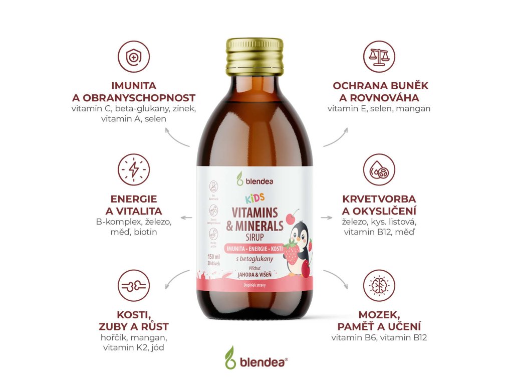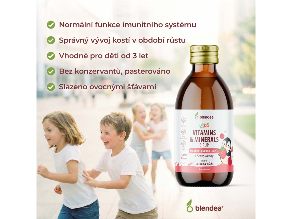 Blendea KIDS VITAMINS & MINERALS je chutný sirup s pečlivě vybranými vitaminy a minerály pro děti od 3 let.