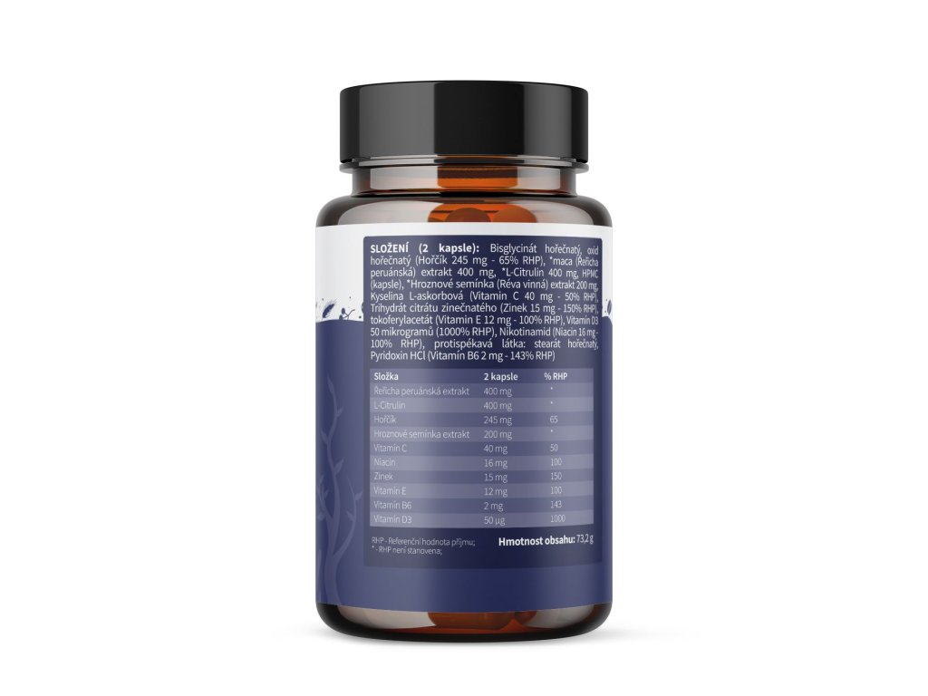 Kombinace účinných rostlinných extraktů a esenciálních minerálů v kapslích Blendea Man’s Vitality pro podporu mužského libida, plodnosti, výkonnosti, hormonální rovnováhy a celkové vitality. | 60 kapslí