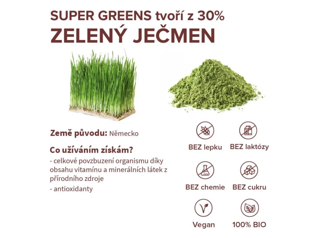Mladá pšenice a zelený ječmen obsahují vitamíny a minerální látky. Chlorella zase dodá tělu potřebnou energii a předchází tak chronické únavě.