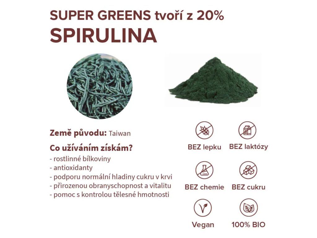 Zdravé účinky si SUPERGREENS zanechává nezměněné. Směs zelených superpotravin se postará o bezproblémovétrávení, silnou imunitu a postupně vás nechá zapomenout na nafouklé bříško. Úleva od nafouklého břicha je jedním z hlavních zákazníky hlášených prospěšných účinků SUPERGREENS.