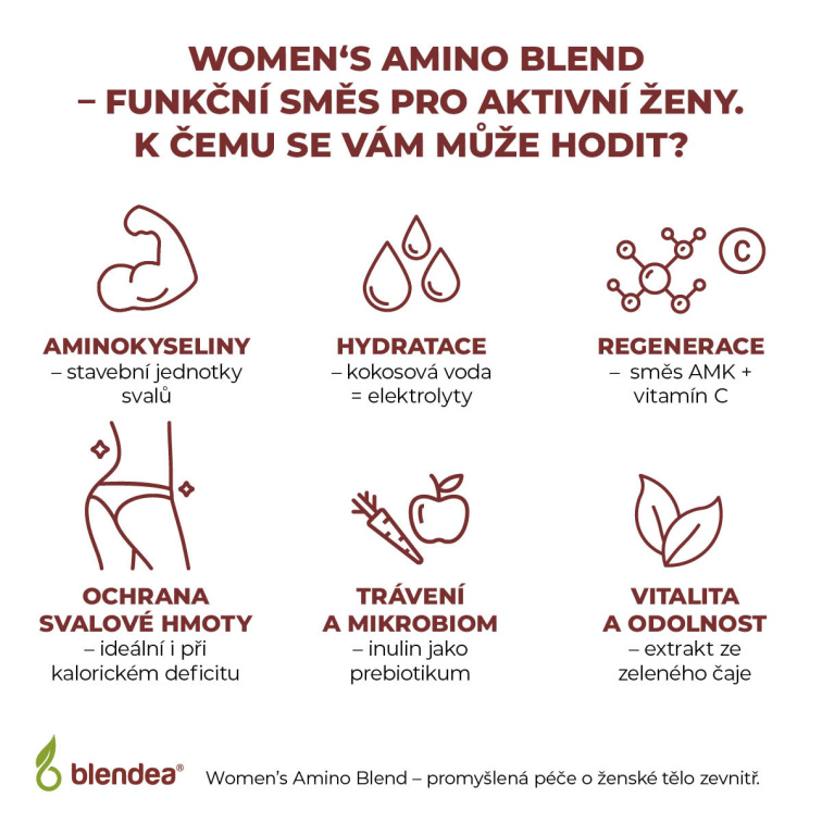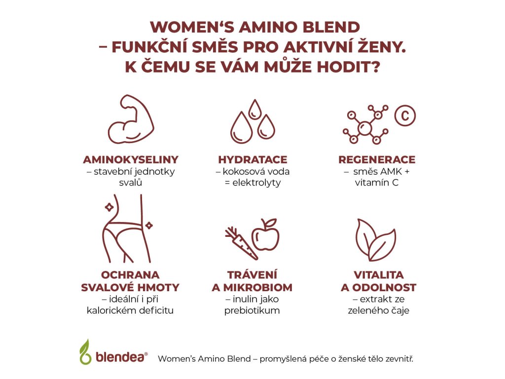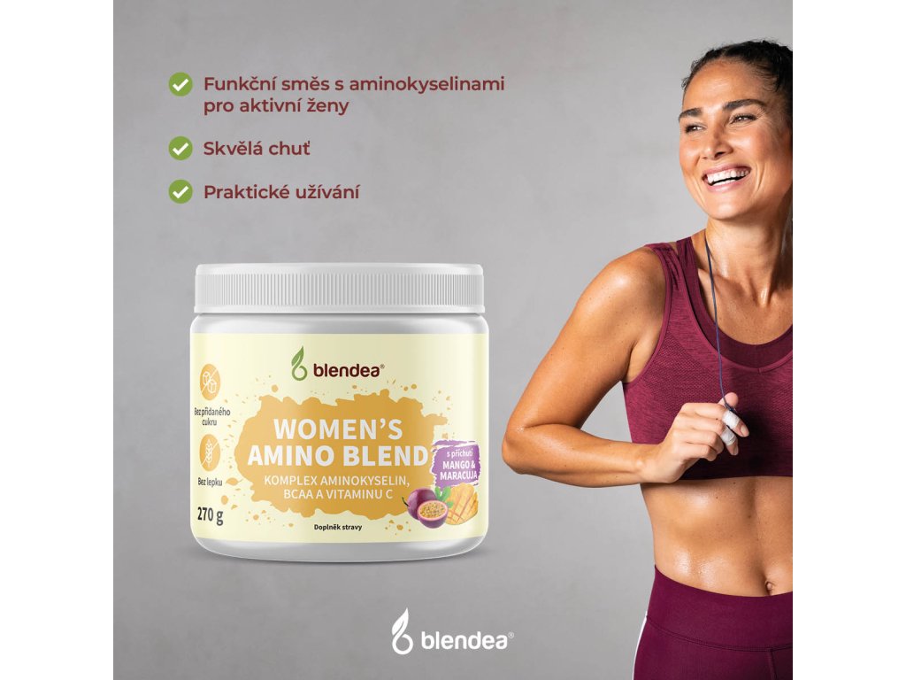 Women's Amino Blend je směs aminokyselin pro ženské potřeby. Obsahuje látky pro období zvýšené fyzické aktivity, regenerace, udržení svaloviny a péče o tělo, pokožku, kosti a trávení. | 270 g, 30 dávek