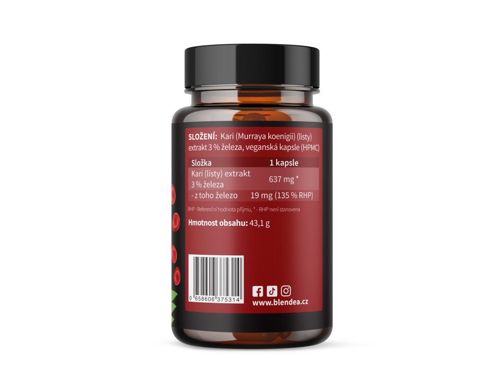 Nehemové železo z kari lístků v kapslích podporuje tvorbu červených krvinek, přispívá k přenosu kyslíku v těle a snižuje únavu.